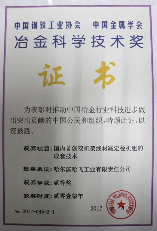 為表彰對(duì)推動(dòng)中國(guó)冶金行業(yè)科技進(jìn)步做出的突出貢獻(xiàn),冶金科學(xué)技術(shù)獎(jiǎng)獎(jiǎng)勵(lì)委員會(huì)決定對(duì)78個(gè)項(xiàng)目授予2017年中國(guó)鋼鐵工業(yè)協(xié)會(huì)、中國(guó)金屬學(xué)會(huì)冶金科學(xué)技術(shù)獎(jiǎng),我公司“國(guó)內(nèi)首創(chuàng)雙機(jī)架線(xiàn)材減定徑機(jī)組的成套技術(shù)”獲得二等獎(jiǎng)。我公司是冶金系統(tǒng)外的冶金設(shè)備制造商獲得此獎(jiǎng)項(xiàng),標(biāo)志雙機(jī)架線(xiàn)材減定徑機(jī)組成套技術(shù)對(duì)中國(guó)冶金行業(yè)科技創(chuàng)新、技術(shù)進(jìn)步有重要意義。