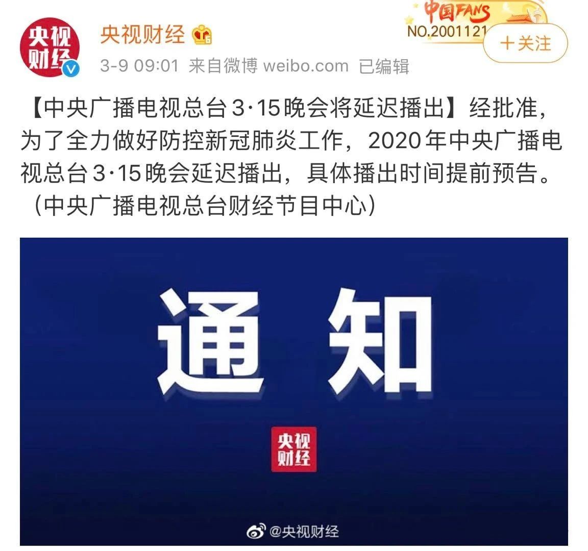 據(jù)@央視財經(jīng) 今天早上9點消息:經(jīng)批準(zhǔn),為了全力做好防控新冠肺炎工作,2020年中央廣播電視總臺3·15晚會延遲播出,具體播出時間提前預(yù)告。