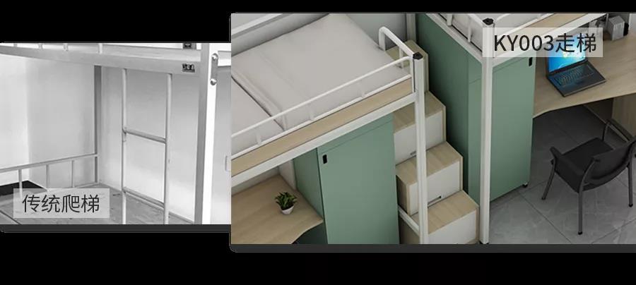 傳統(tǒng)公寓床爬梯,一根細(xì)細(xì)的鋼管冰冷、硌腳、滑。使用者上下床總是要小心翼翼的,怕一不小心就滑下來。
