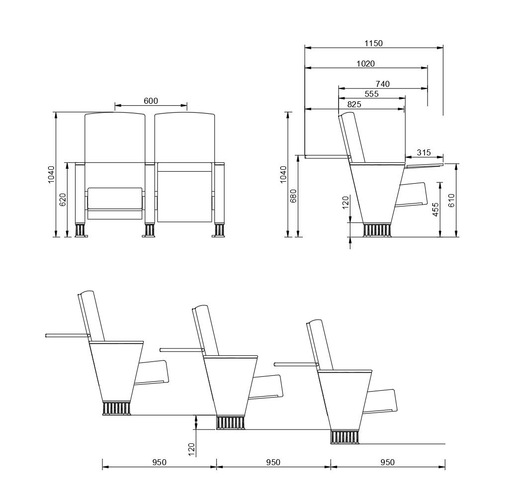 1.椅子總高度1050mm,連排座椅中心距離560mm--580mm,座面高度440mm;