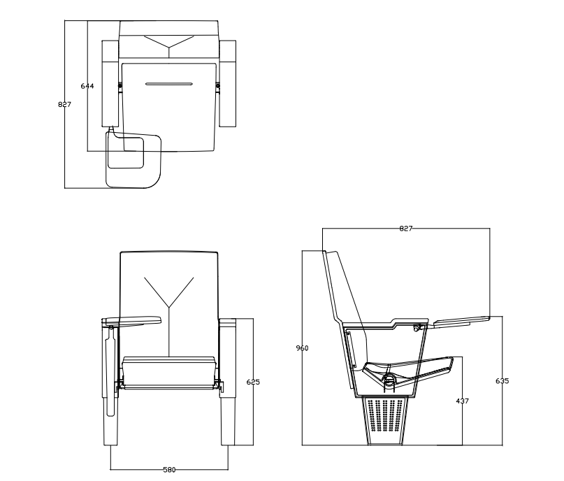 1.椅子總高度960mm,連排座椅中心距離560-580mm,座面高度440mm;